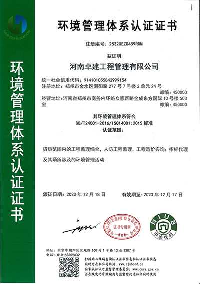 環(huán)境管理體系認(rèn)證證書
